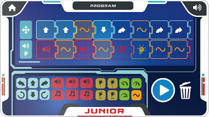 You control Juniors’s movements and sounds. Have fun and drive Junior by remote control or by using your device as a gyroscope. Code programs for Junior using an easy, visual interface included in the app.